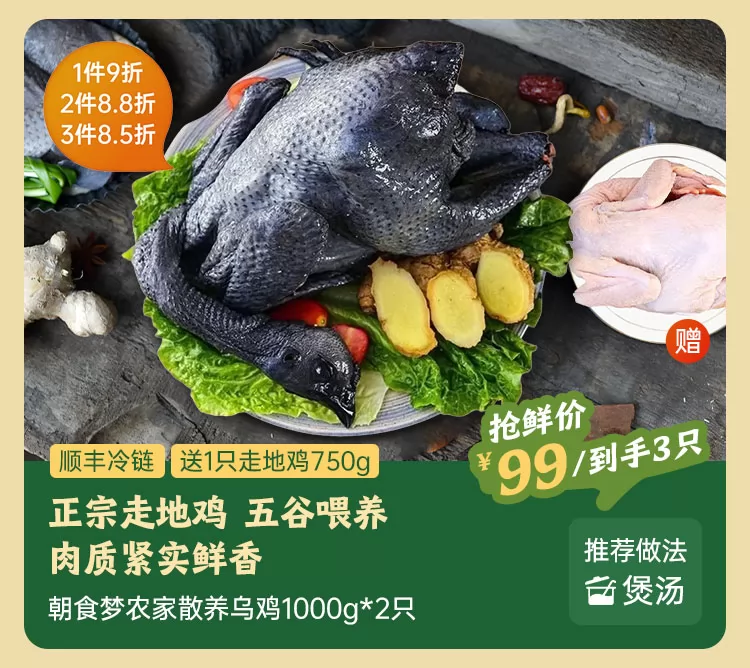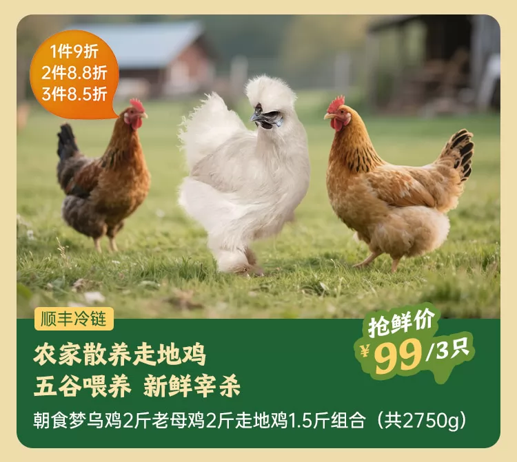 【顺丰包邮】朝食梦乌鸡2斤老母鸡2斤走地鸡1.5斤组合(共2750g)