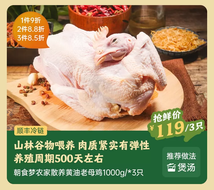【顺丰包邮】朝食梦农家散养黄油老母鸡1000g*3只