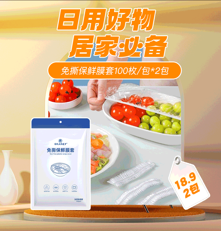 GRAREY免撕保鲜膜套(时尚三色)100枚/包*2包