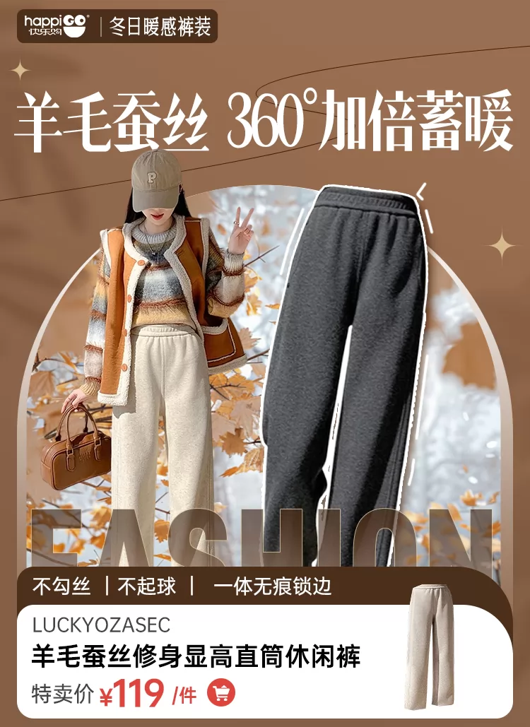 LuckyOzasec女士里层蚕丝羊毛窄版直筒休闲裤YMS-9297