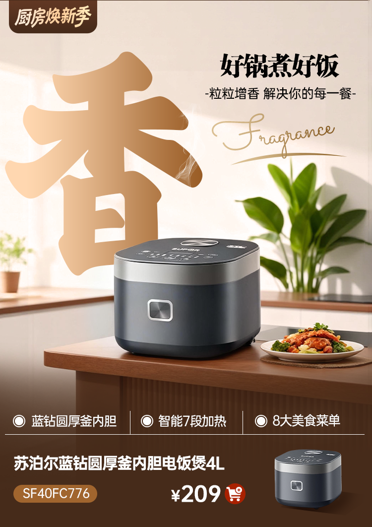 苏泊尔4升电饭煲聚能不粘内胆智能预约家用二级能效SF40FC3035