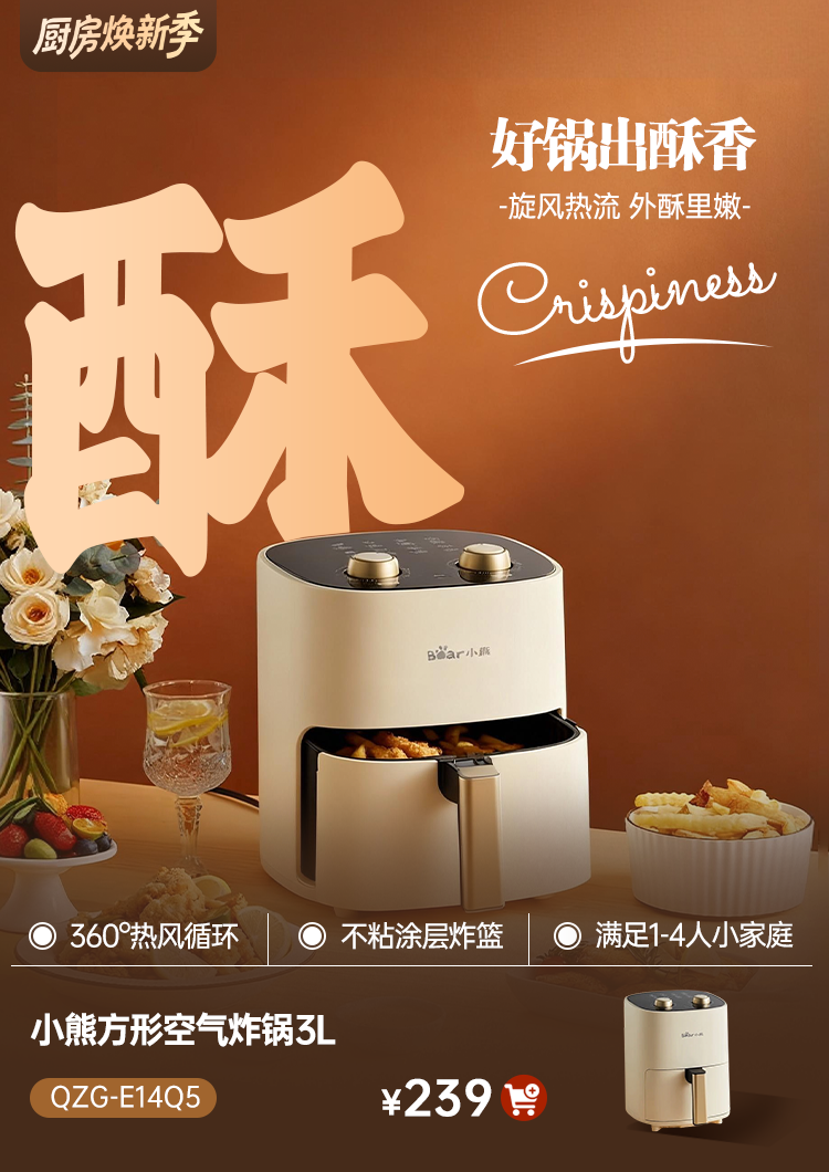 小熊(Bear)空气炸锅3L大容量大功率无油烟电炸锅3LQZG-E14Q5