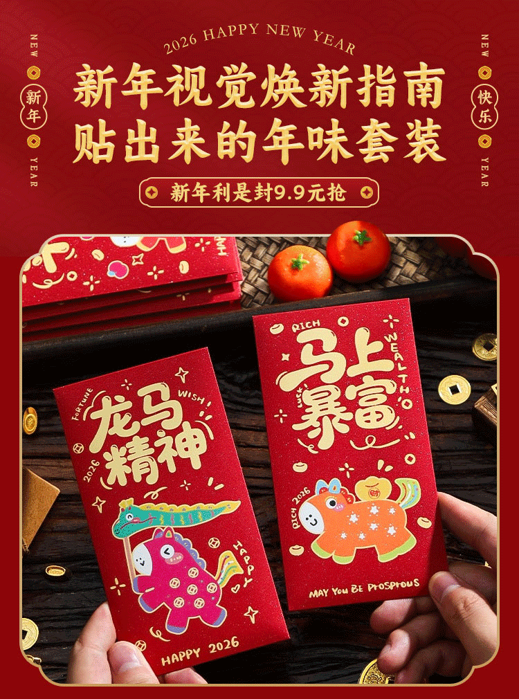 2026新款马年红包袋新年利是封春节卡通拜年压岁钱包18个