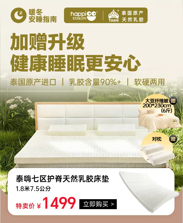 泰嗨七区护脊乳胶床垫,7分区精准承托腰椎,全身放松才能睡个好觉!1.8米大床标配,7.5cm厚度支撑力十足,限时加赠品牌对枕与暖冬被,一站式备齐冬眠装备。