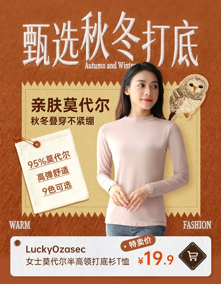 LuckyOzasec女士莫代尔半高领打底衫长袖T恤(中厚款)BY=MDBG