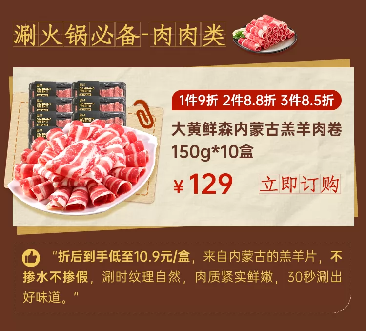 大黄鲜森内蒙古羔羊肉卷150g*10盒